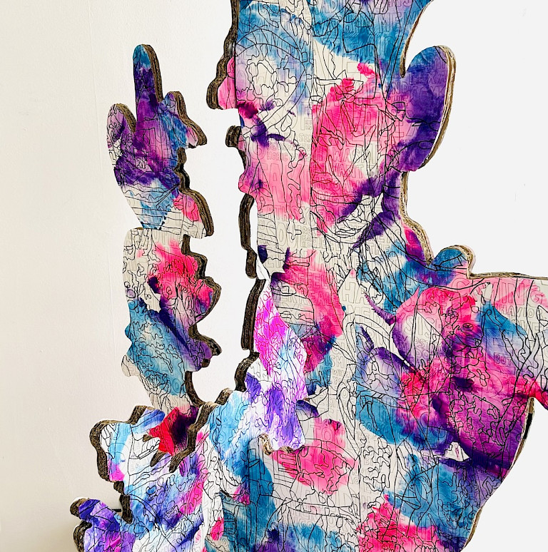 In her practice she tries to work with, and not against, the distractions and interruptions coming from body and brain, including its physiological patterns and menstrual cycles. These cause her to work back and forth between various processes and media, resulting in a variety of 2-D and 3-D works.