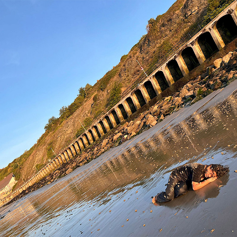 'edge states' is a triptych of performances devised by Sidonie Carey-Green, Josephine Carter and Farida Yesmin. Three works unfold at sunset and sunrise on consecutive days, tracing a path from the Harbour Arm to Sunny Sands. ‘concrete’ evokes crumbling cliffs, where dancers shoulder and shed the weight of permanence. ‘time and tides’ invites participants to contribute clay spirals to Farida Yesmin’s body as she lies with the lugworms at low tide. Linking these two actions, plastic sheeting becomes shared skin in ‘cutaway ii’, stretching across performers’ bodies as they traverse Folkestone’s coastal edges.