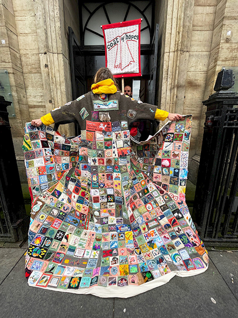 Coat of Hopes is now in the 4th year of a pilgrimage with no end in sight, having committed to keep walking whilst we remain in a state of climate and ecological crisis. Wherever the Coat goes it carries an invitation to all who are willing; to wear it, hear its song, and stand for a moment in consciousness of our connection with each other, all who have made and worn the Coat before us, and all life, stopping to be present and consider the way we live.