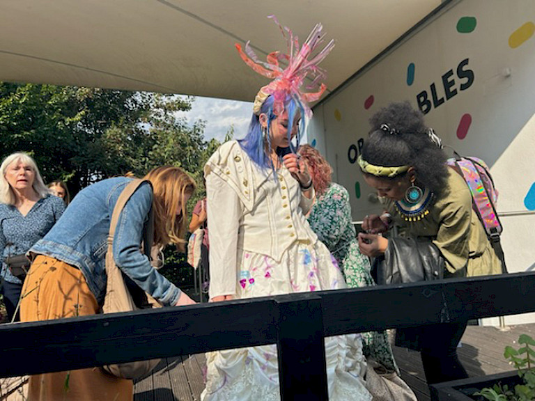 a:dress takes Folkestone streets by storm with a Sew-In and customised, message-emblazoned clothes. Come and chat and share ideas of what we can do in the town to slow down fast fashion and save the planet. Embellish an evening dress with cut-up plastic bottles and see your work in a future Subversive Catwalk. Then take a stroll to visit the iconic Anthony Gormless in his town-made tutu.