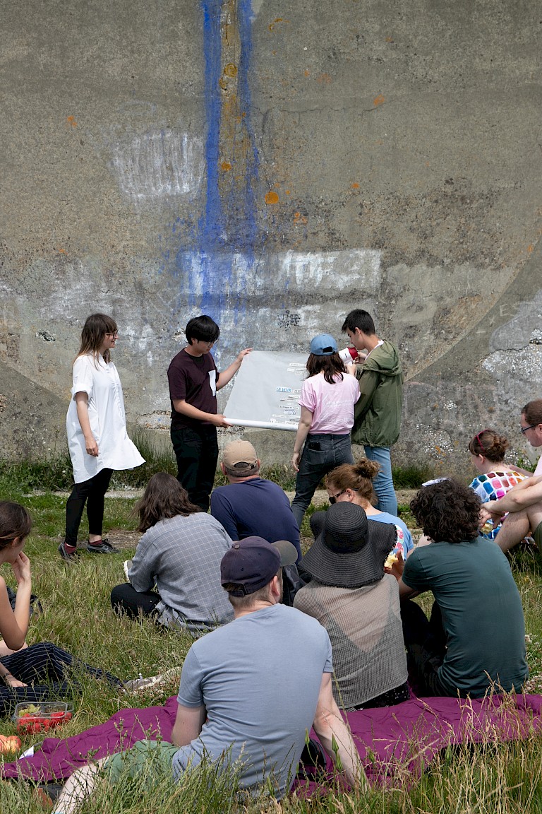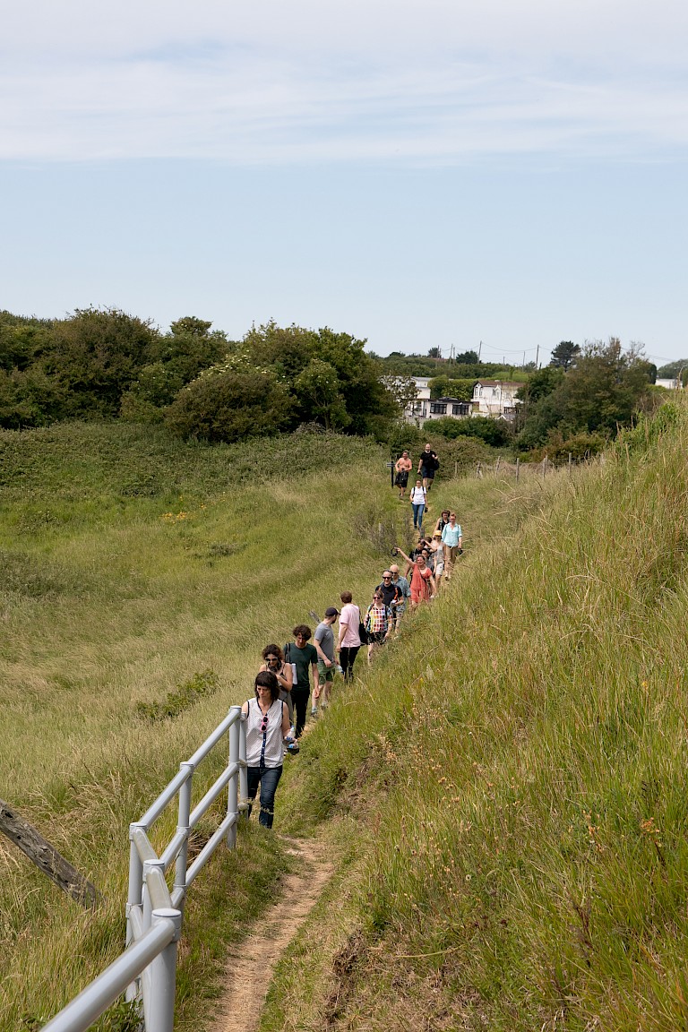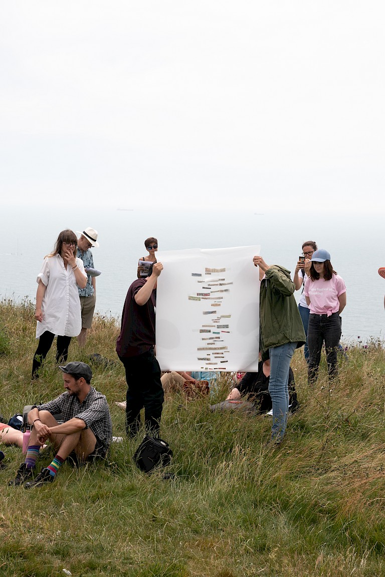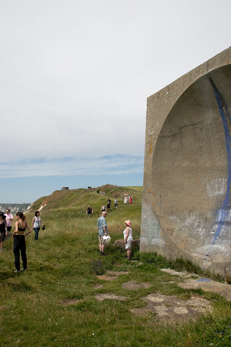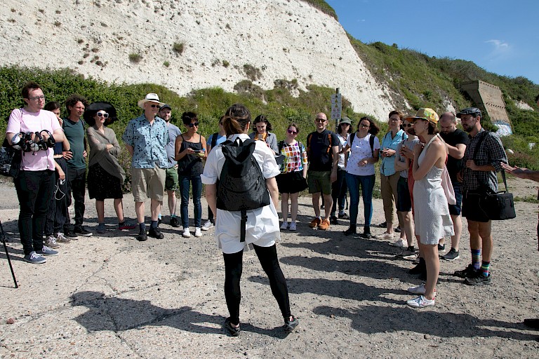 The Folkestone Trails II - "Landing Mirrors" - explore critical migration thresholds along the English Channel. It consolidates two opposite shores, the city of Folkestone in England and the city of Calais in France, into a single conceptual territory, which tends to defy political borders and to provoke independent imagination of spatiality and sociality across the sea. The trail includes peripatetic investigations of materializations of border tensions throughout history, embodied in sound mirrors. Acoustic early warning systems, a forerunner of radar, sound mirrors were intended to provide early warning of incoming enemy aeroplanes and airships about to attack coastal towns during the WWI. The walk will end in a rehearsal performance of an “Ode to Liberty” at the Abbot’s Cliff, as a form of “social act of mirroring” across the English Channel, from the scale of the body to the scale of territory.