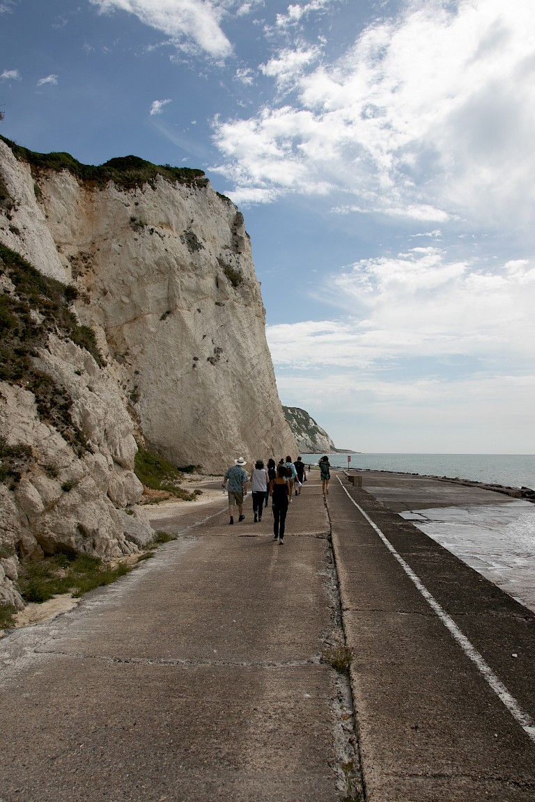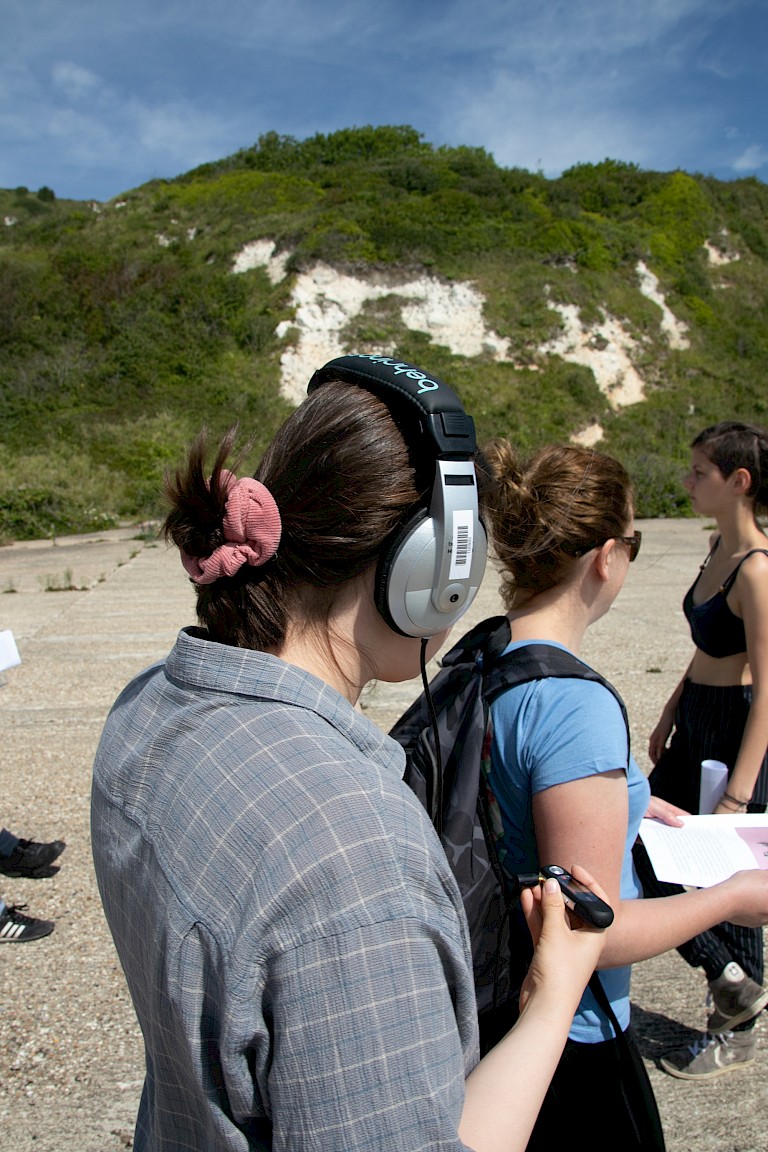 "The idea behind the workshops is to think of two opposite shores as a single conceptual (geological) territory, and to provoke independent imagination of spatiality and sociality across the sea. The introductory trail that was undertaken down the Warren and up the cliffs, under extreme weather conditions, included the investigation of historic materialisations of border tensions, ending at the Abbot’s Cliff sound mirror with a reading of original acoustical reports (1934) on the “Operation of the Mirrors”.