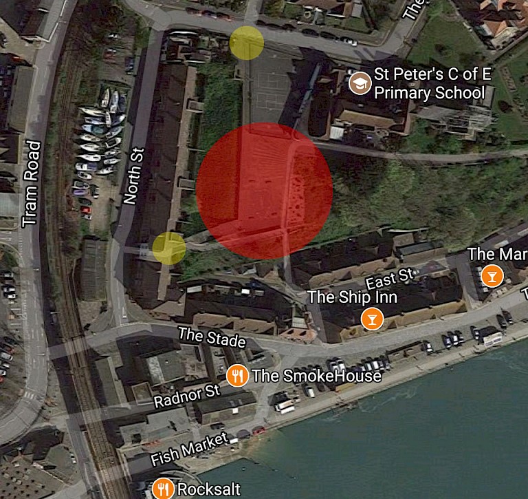 Red Circle: Location Yellow Circles: Entry Points. (Northern Entry Point is wheelchair accessible)