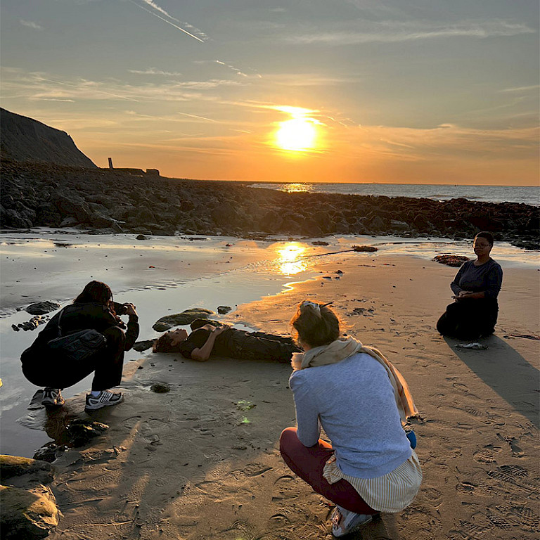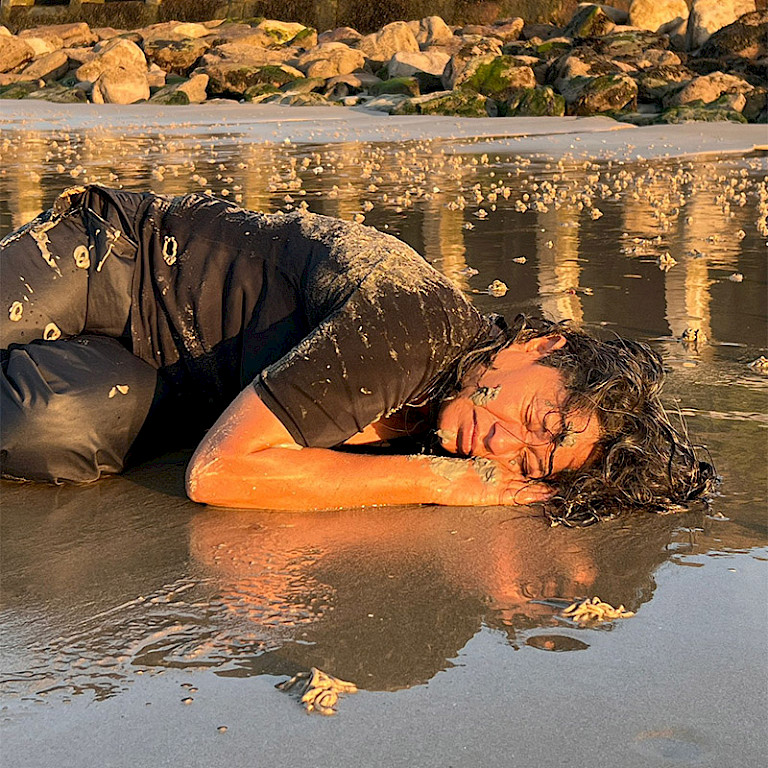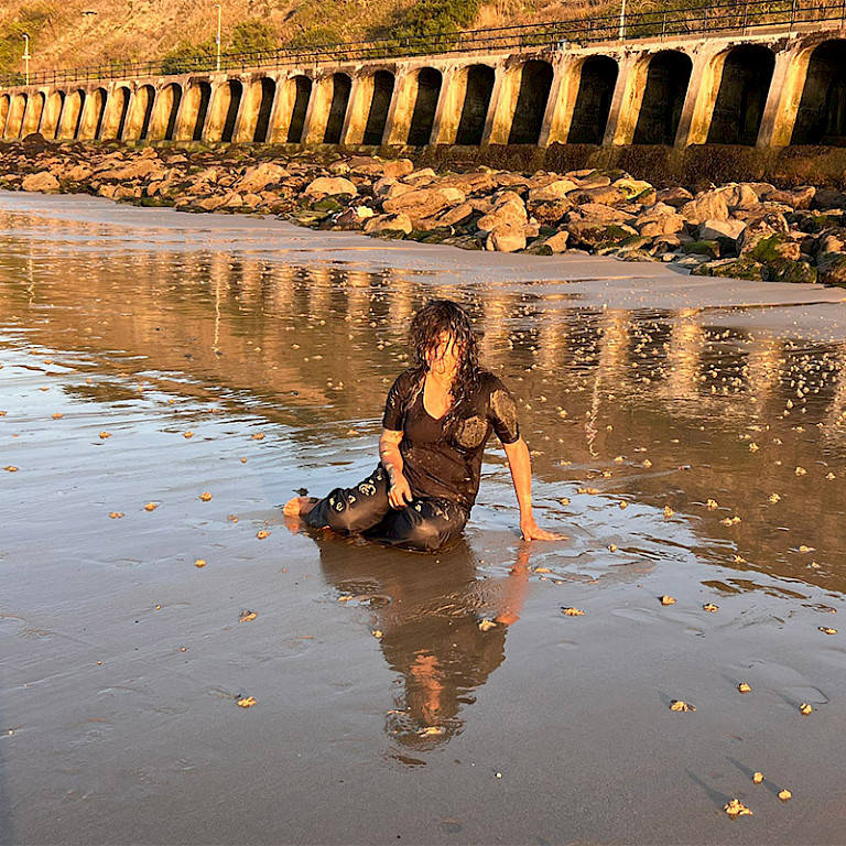 'edge states' is a triptych of performances devised by Sidonie Carey-Green, Josephine Carter and Farida Yesmin. Three works unfold at sunset and sunrise on consecutive days, tracing a path from the Harbour Arm to Sunny Sands. ‘concrete’ evokes crumbling cliffs, where dancers shoulder and shed the weight of permanence. ‘time and tides’ invites participants to contribute clay spirals to Farida Yesmin’s body as she lies with the lugworms at low tide. Linking these two actions, plastic sheeting becomes shared skin in ‘cutaway ii’, stretching across performers’ bodies as they traverse Folkestone’s coastal edges.