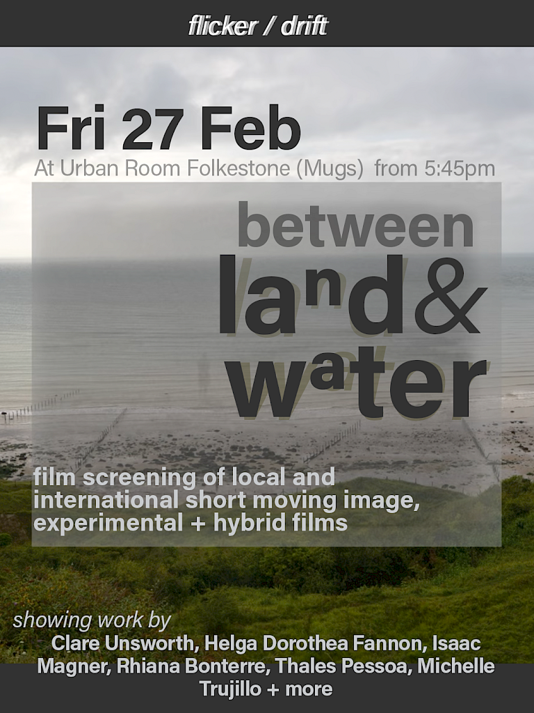 flicker / drift is a new monthly moving image, experimental and hybrid film screening event based in Folkestone. It takes place at The Urban Room Folkestone in the town centre – an intimate space that will transform into a collective viewing environment for artists and audiences to gather, watch, reflect, and discuss. The aim is to highlight local, national, and international filmmakers at different stages of their practice, including works in progress, and to create space for conversation and exchange in Folkestone and among its [extended] community.