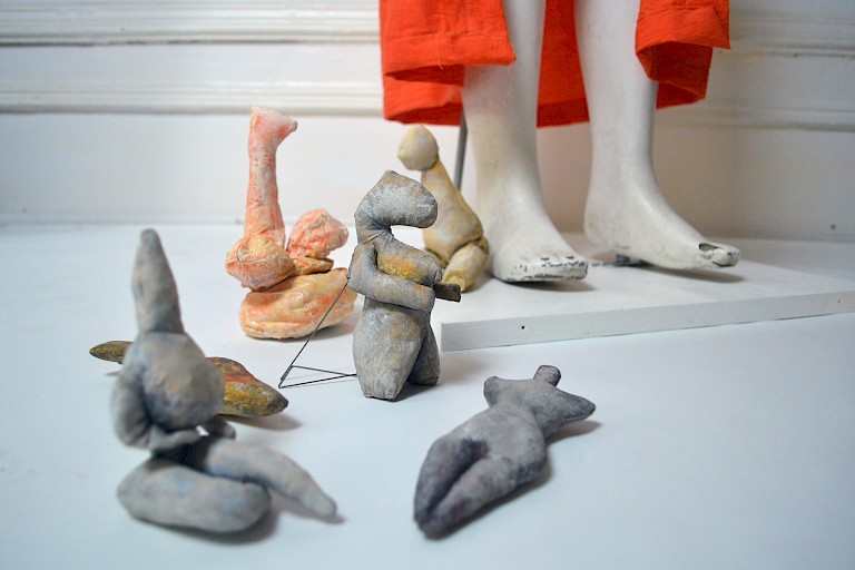 'Hide' is a sculptural installation building on ideas of the home, childhood, intimate spaces and domestic claustrophobia. The work forms a landscape which visitors can enter and inhabit. It explores the human need for shelter, and our desire to control/ create our environment, staking our place in the world.