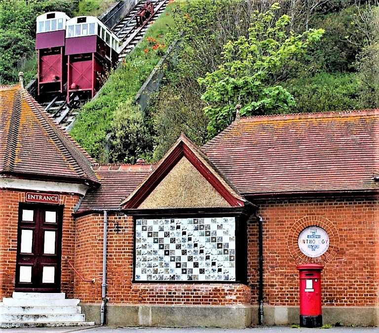 “When Folkestone Leas Lift said ‘yes’ to our request to use the front of the building, it all fell into place,” said artist Maureen Jordan. “Many of the images submitted showed a strong sense of place and the Lift is a beloved landmark in Folkestone that signifies happy times remembered and also plans for more fun in the future”.