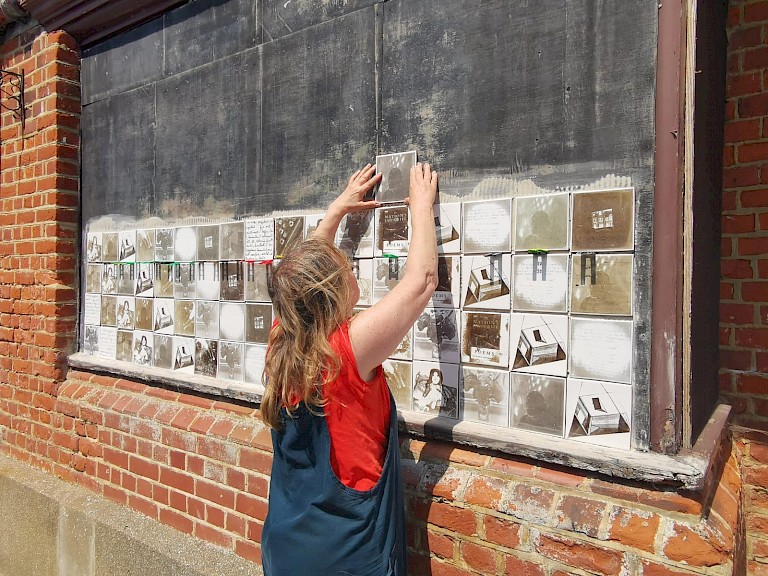 In response to Kent Coast Volunteering’s Anthology project callout for creative volunteers, artists Maureen Jordan, Katy Murray and Sam Capell collated images provided by users of KCV’s ‘Good Neighbours’ service. These were screen-printed onto white household tiles then affixed to the boarded window at the front of Folkestone’s Leas Lift lower station, on the part of the building housing the pump room to the side of the Leas Lift Café which helps raise funds for the restoration.
