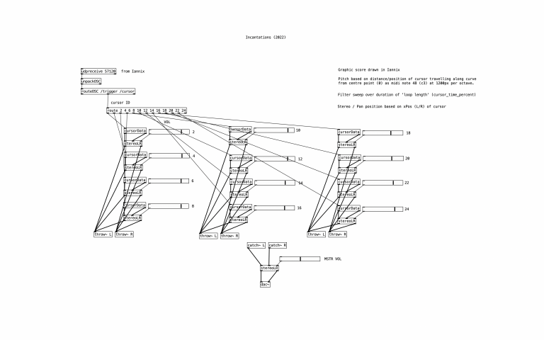 The symbols and shapes are used as graphic scores, redrawn in graphical sequencing software, and interpreted radially. A cursor running along each continuous line is programmed to produce and control the parameters of a separate tone. Each symbol forms a unique sonic motif and perpetual interplay of pitch and rhythm that gradually shifts in and out of phase.