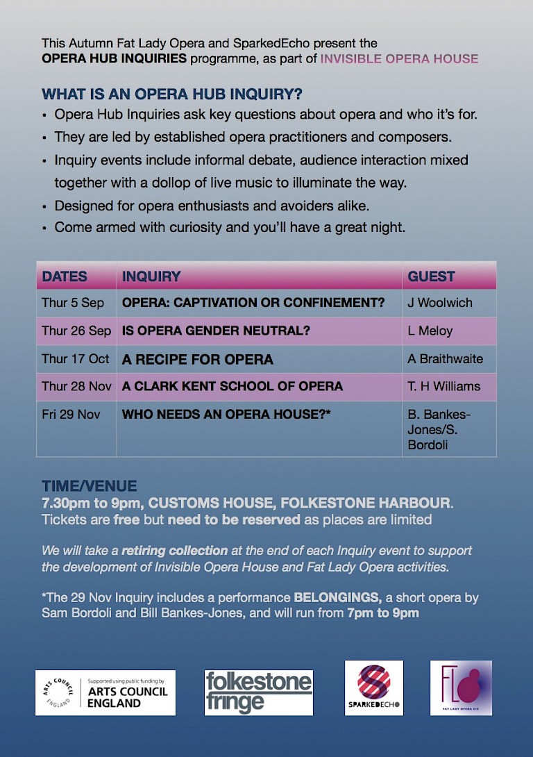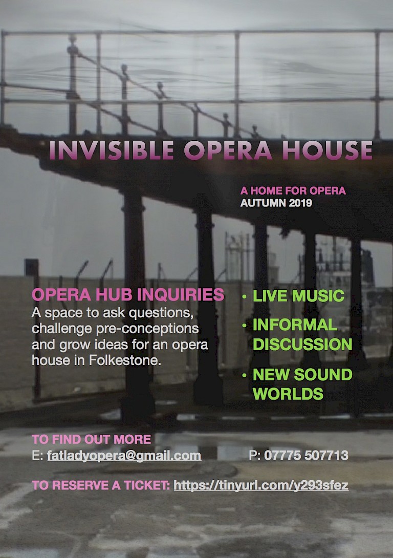 Opera Hub Inquiries are part of a larger project called Invisible Opera House - which is seeking a home for opera in Folkestone. The Inquiries programme aims to provoke discussion and collaborate with the audience to draw together insights into the grand art, with some informal live music to illuminate the way.