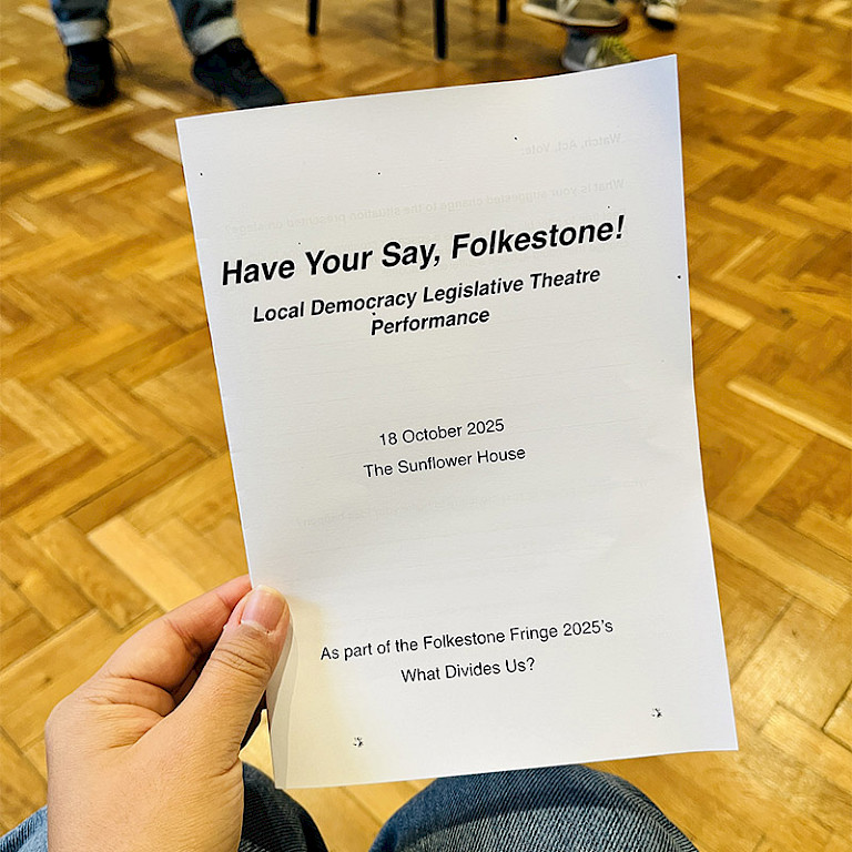 The Folkestone Performing Arts Company’s Legislative Theatre Project will bring the local community & and policy-makers (councillors, MPs, business owners and other change-makers) together to co-create innovative and effective solutions to complex challenges that are faced by Folkestone residents. Community members will spend the morning creating a short piece of theatre based on lived experiences, addressing local or national policy challenges.