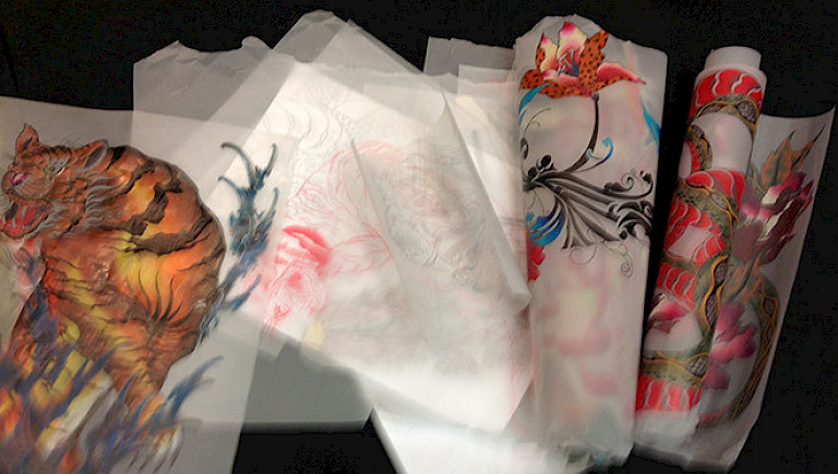 The backdrop of tattooer using multiple textures to canvas and the politics of Chinoiserie in the Victorian era, are both designed to play and respond to the ‘idea’ of West and East.