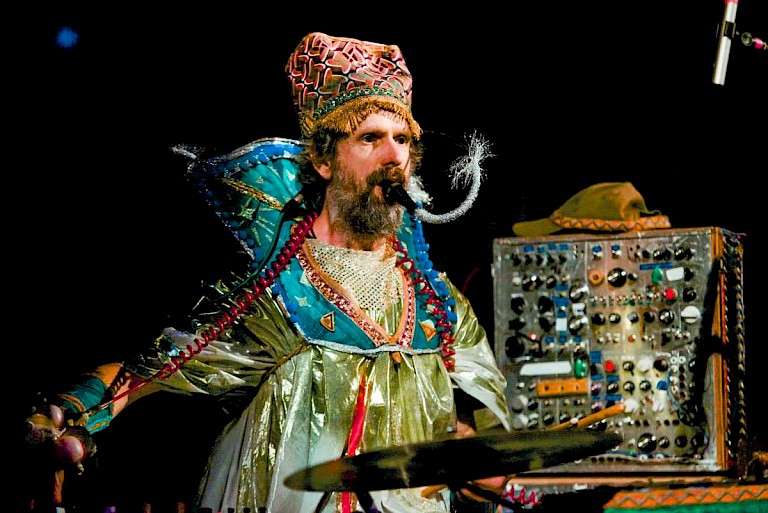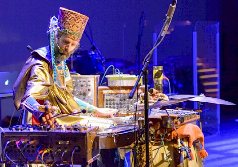Often dressed in an elaborate gold costume and occasionally sporting a huge head mask, Paddy adapts existing instruments and builds his own to create liberating, semi-improvised surreal synth-pop.