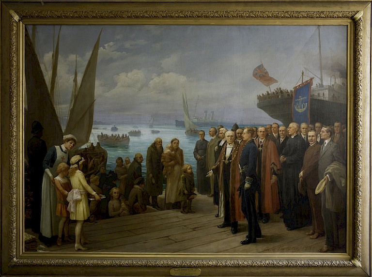 On a sunny day last October, 300 people gathered at Folkestone Harbour Arm to recreate a 100-year-old painting that celebrates the warm welcome given to 100,000 Belgian refugees when they arrived in Folkestone in WW1. The as yet unseen photograph taken of this event will also be going on display in Folkestone Museum. There will be a short film showing the making of 'The Landing of the Belgian Refugees Revisited' on the day.