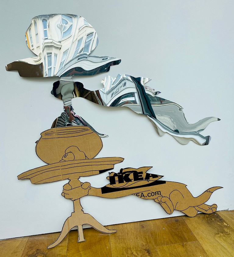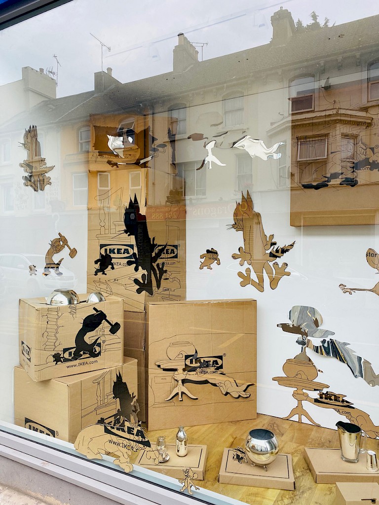 The project began with a used Ikea cardboard box from which Boggon made cut-outs of Tom and Jerry, placing them in a destructive domestic environment. Over several months, the work developed its own interactive narrative as Boggon added shadows mirrors and silvered household vessels which reflected the street and passers-by. Each new chapter was revealed as part of Last Fridays Folkestone.