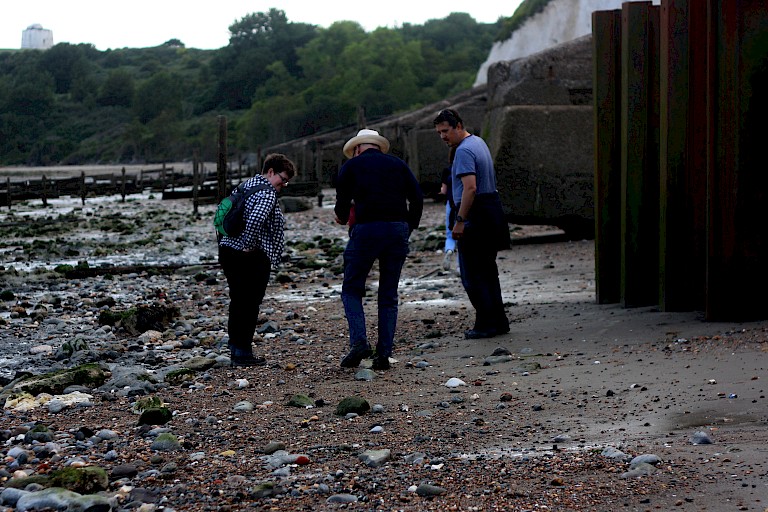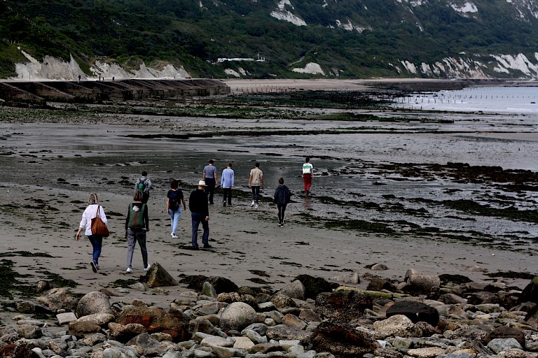" We arrange to meet while the tide is out. Starting high up on the cliff, we make our way down the cliff side. Moving in silence, I notice the sounds surrounding us and the rhythm of our steps. We pause every now and again and a memory, a tale, a fact, or a direction is shared. We continue moving downwards and I’m following a path I’ve never been down before. As I’m moving along this well-trodden path and, as I catch a glimpse of a tall ship out at sea, a strong sense of times and people past comes over me. We arrive at the beach and the open expanse of water is cleansing. As I look back up to the top of the cliff, the depth of the land seems intensified and my feet feel rooted. Its force is pushing me towards the ground, as if I am part of it. "