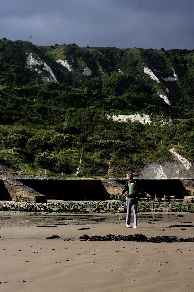 This is the place where dance artist Siobhán Ní Dhuinnín is making a new piece of work. She has been walking this path every day for the past two weeks, acquainting herself with the landscape and its many faces. Sometimes, she asks a member of the local community to join her and invites them to share their memories, knowledge, and feelings of the place. Every story, comment, and pause is individual and through gathering them all together, Siobhán has developed a deep and broad understanding and relationship with Folkestone.
