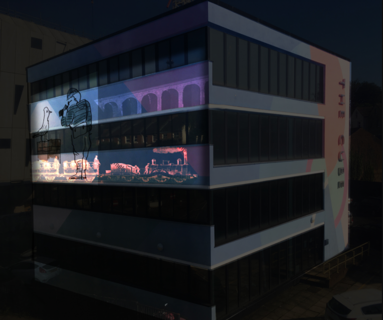 Celebrating the engineering marvels that make up Folkestone’s townscape, including the Railway Viaduct, Zig Zag Path and F51 Skate Park, in animated form. The work engages with Triennial artist Sinta Tantra’s colourful treatment of The Cube building that was inspired by an early railway poster promoting holiday travel to Folkestone. The Cube becomes a screen, illuminated with intersecting snippets of Folkestone’s distinctive history and spectacular environment that we all inhabit.
