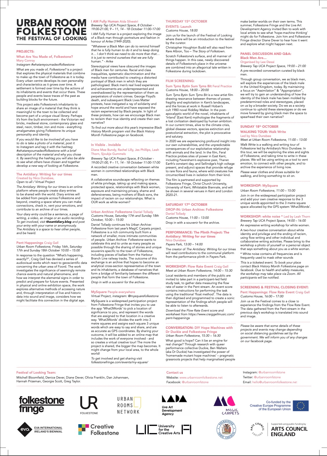 Through Urban Room Folkestone, the Folkestone Fringe team are stoked to be producing the second iteration of the Festival of Looking! Combining the third year installment of our 2020 Magic Carpets projects; more developments & presentations - both physical & virtual - of our projects such as MySquare & Antidiary which were conceived during lockdown; as well as a wider exploration towards the state of our town today through the lens of both local and global circumstances... are intertwining to create the fests' title & theme - What's happening, exactly? Keep scrolling to learn more.